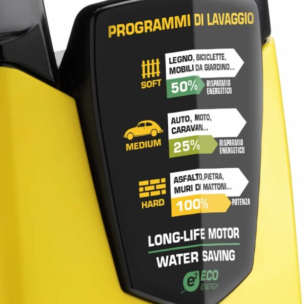 - Compatta, potente e leggera, offre 3 diverse modalità di utilizzo selezionabili con l’apposito interruttore rotante: lavaggio SOFT per legno, biciclette e mobili da giardino; lavaggio MEDIUM per auto, moto e caravan; lavaggio HARD per asfalto, pietra e muri di mattoni